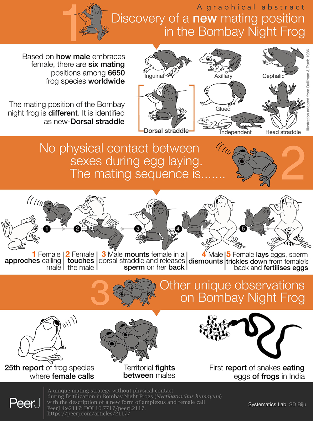 Willaert B, Suyesh R, Garg S, Giri VB, Bee MA and SD Biju*. 2016. A unique mating strategy without physical contact during fertilization in Bombay Night Frog (Nyctibatrachus humayuni) with the description of a new form of amplexus and female call. PeerJ4:e2117; doi:10.7717/peerj.2117. https://peerj.com/articles/2117/ Video | Graphical Abstract | Popular science coverage of this paper in Science | The Guardian | National Geographic | New Scientist | Wired | Daily Mail | Houston Chronicle | Science 2.0 | The Science Explorer | Gizmodo | Motherboard | Sandiego News | Times of India | Discover Magazine | Live Science | UK mirror | Zeenews | Kansas City News | New York daily News | How Stuff works | AP (Associated Press) | AFP (Agence France Presse) | The Telegraph | The China Post | NDTV | Science daily | KU TV | Mongabay | ABC News | Eurekalert | Weired Asia News | San Francisco Chronicle | Chicago Suntimes | The Late Show with Stephen Colbert | Nature News | Amphibia Web | Metro UK | NBC News | among many others